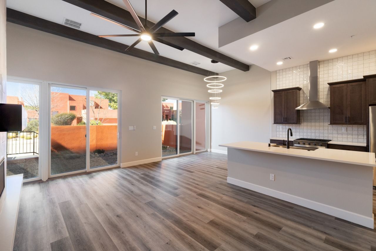 Welcome to Unit #45 at Zocalo, Santa Fe?A refined interior unit that perfectly melds luxury with comfort. As you step into the inviting foyer, you are presented with two enticing options: descend to the lower level where the expansive great room awaits, complete with modern grey toned, sophisticated brushed nickel finishes, and contemporary maple-finished flooring that radiates modern elegance. This level also houses the well-appointed kitchen and provides access to the beautifully landscaped patio, ideal for both vibrant entertainment and serene relaxation. Alternatively, ascend to the upper level where you will find the luxurious primary suite, featuring a cozy second fireplace that creates an opulent sanctuary perfect for restful nights. Atop boasts a junior suite offering additional comfort and privacy.